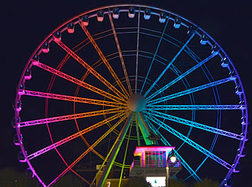 On the Sky Wheel project, we outline the ticket building, we add some big 14” garlands, and big 18” bows along the frontage. We also like to do the Palm trees. They usually get wrapped with warm white LED lights and then to add a little South Carolina southern charm we do the treetops in green LED lights. At night, it makes the palm trees brilliant and they really stand out.